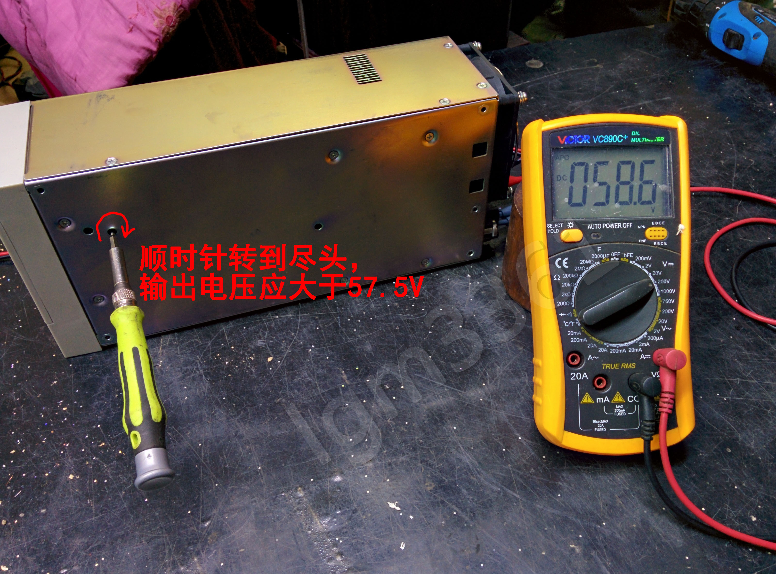 找个合适的一字小螺丝刀,调整电源里的一个多圈电位器,检查输出电压是否合格