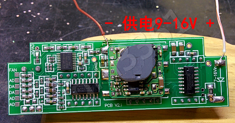 首先给板子焊接两根供电线,供电电压为9-16V。(PCB上的丝印白字写的7-16V是有误的,7V输入的话输出可能到不了5V)