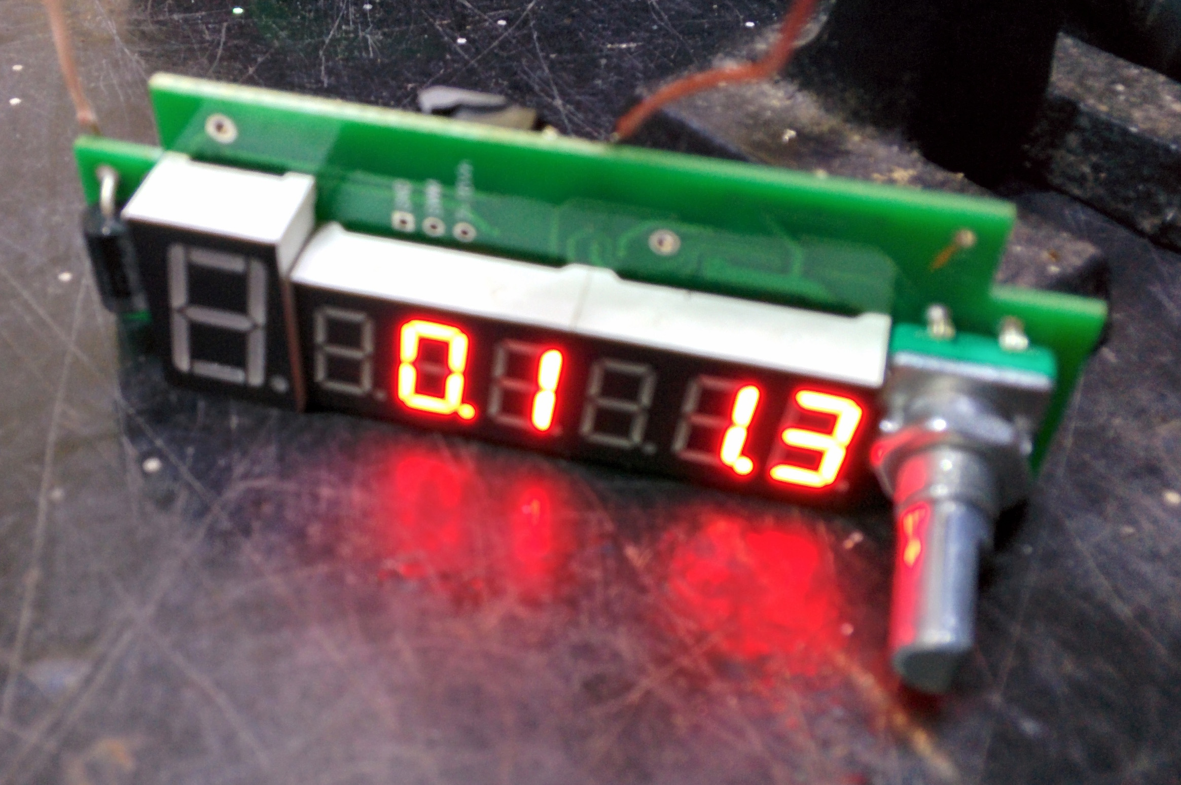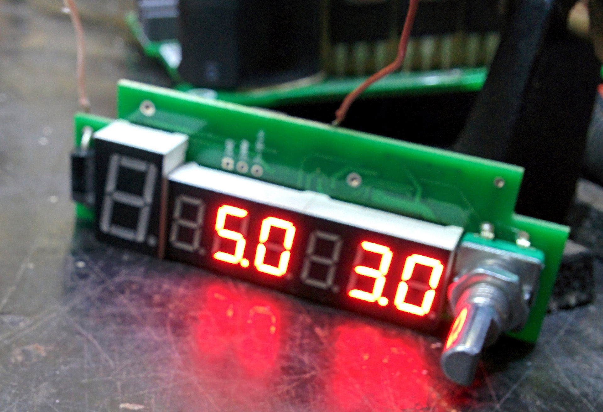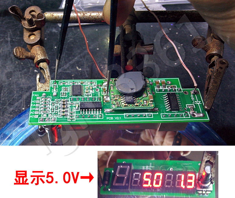 开始通电,数码管会闪动显示目前设定的电压电流,我的出厂程序默认就设定了5.0V 3.0A。