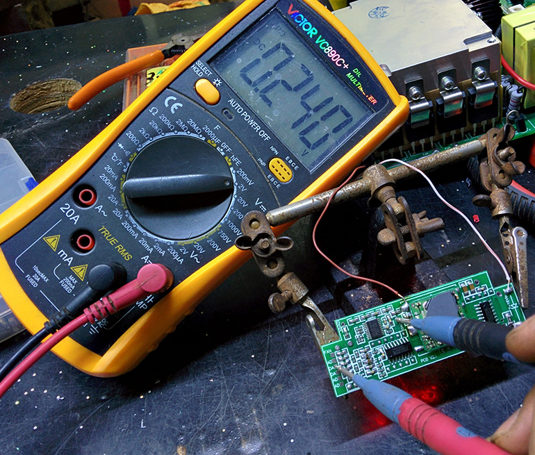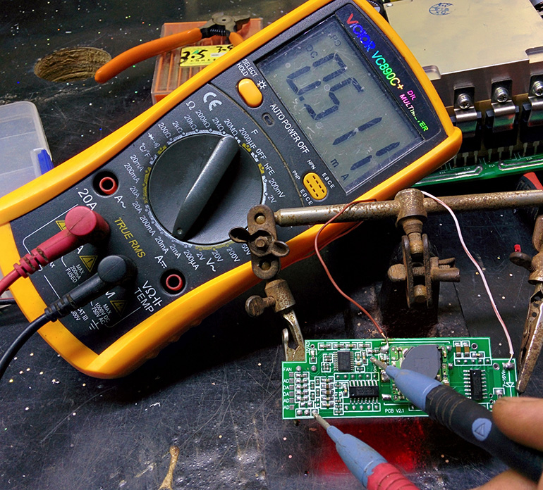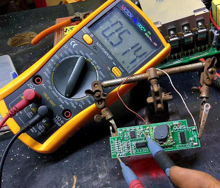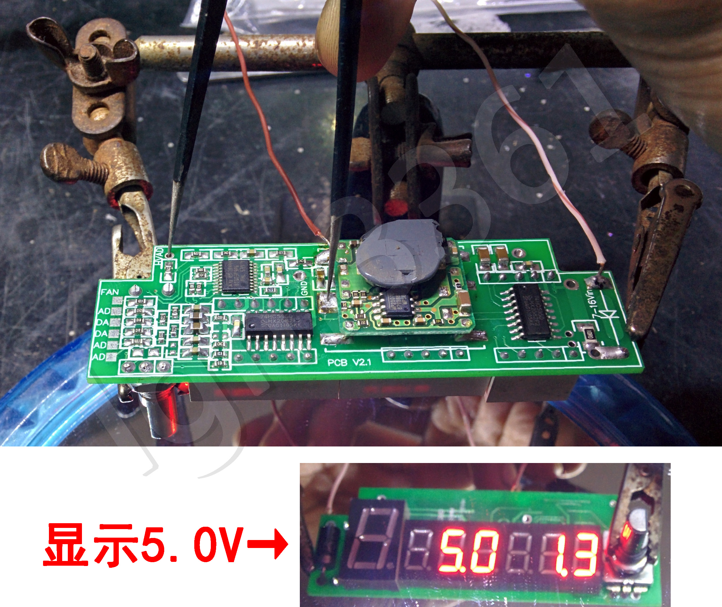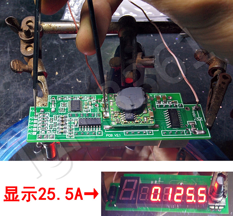 用镊子把单片机5V直接点到【电流AD】,数码管应该显示25.5A,正常范围是25.0-26.0A