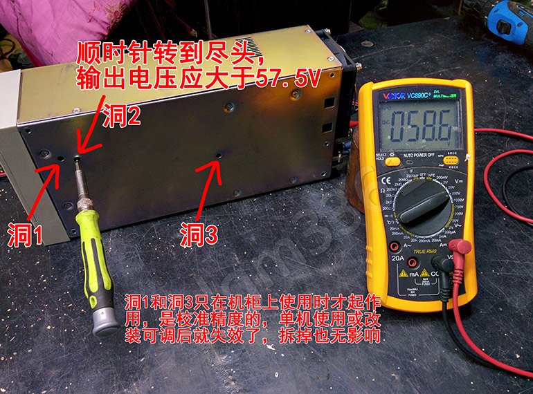 找个合适的一字小螺丝刀,调整如图所示2号洞里的多圈电位器,检查输出电压是否合格