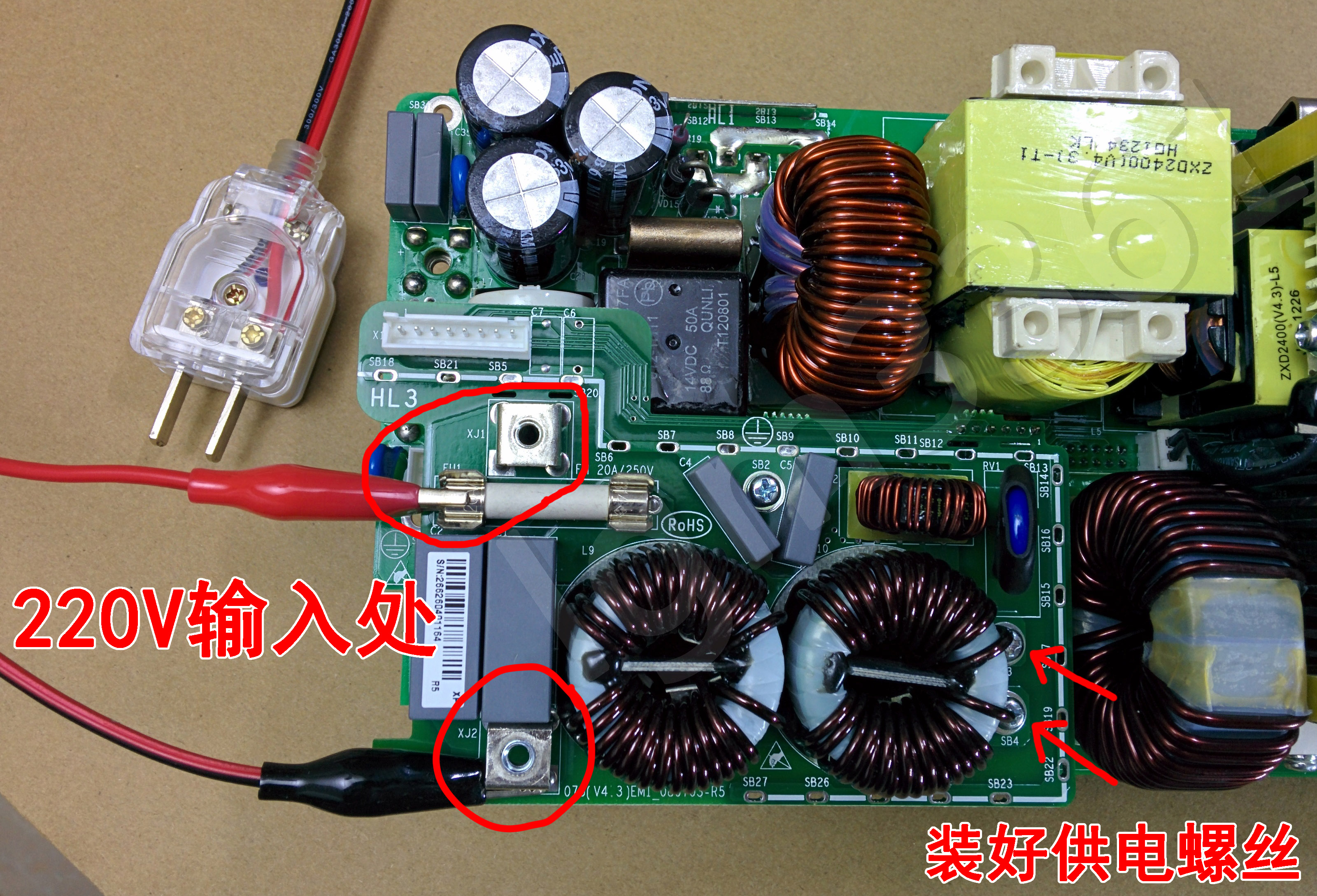 特别注意:此处约有1%的人会把220V接到电源输出端导致炸机,要核对清楚再通电