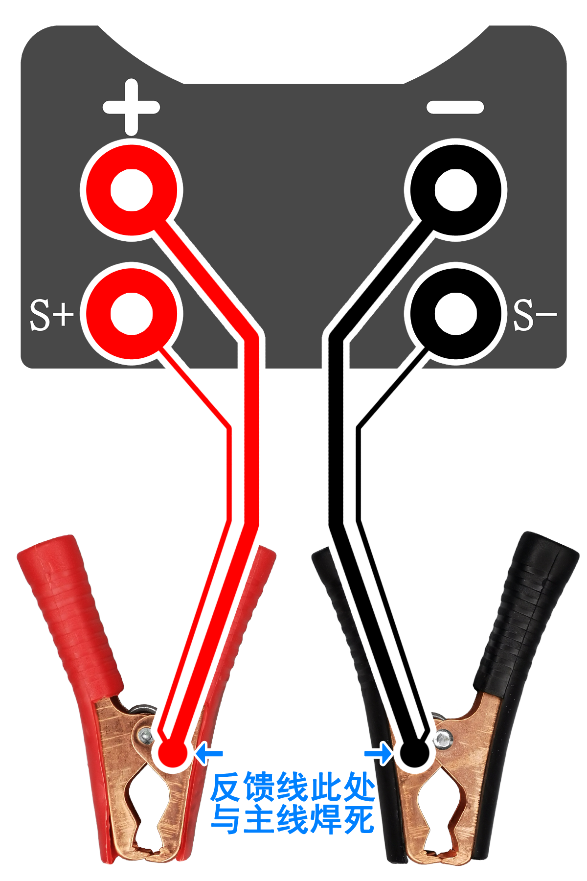 换句话说,反馈线在输出线的多远处焊接汇集,就会补偿多长输出线到主机之间的电压损失。如上方示意图,反馈线与输出线最终在夹子处焊接汇合,就保证了送达夹子处的电压准确。