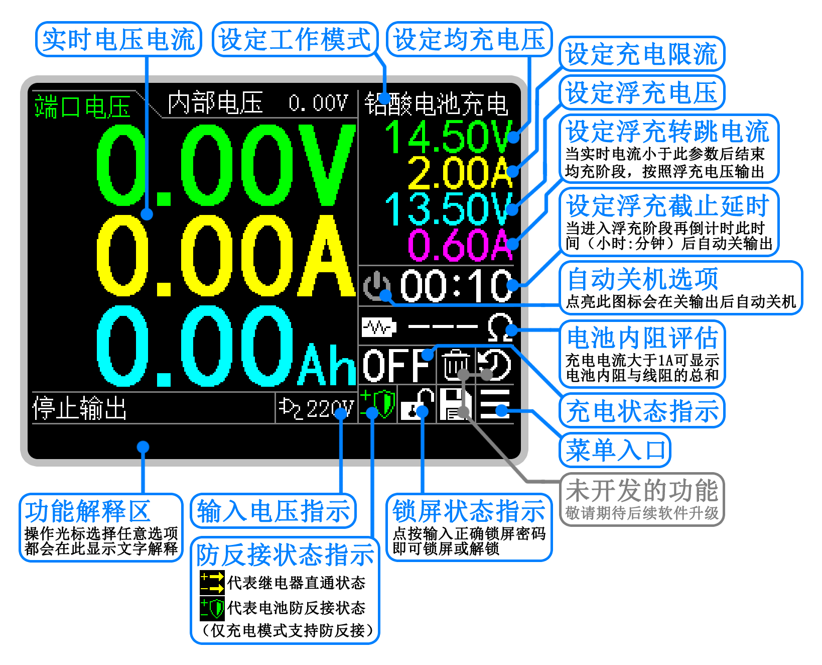 电池充电模式具有电池防反接功能,输出继电器默认是断开状态,未接电池时打开输出会自动关闭输出并且断开输出继电器。